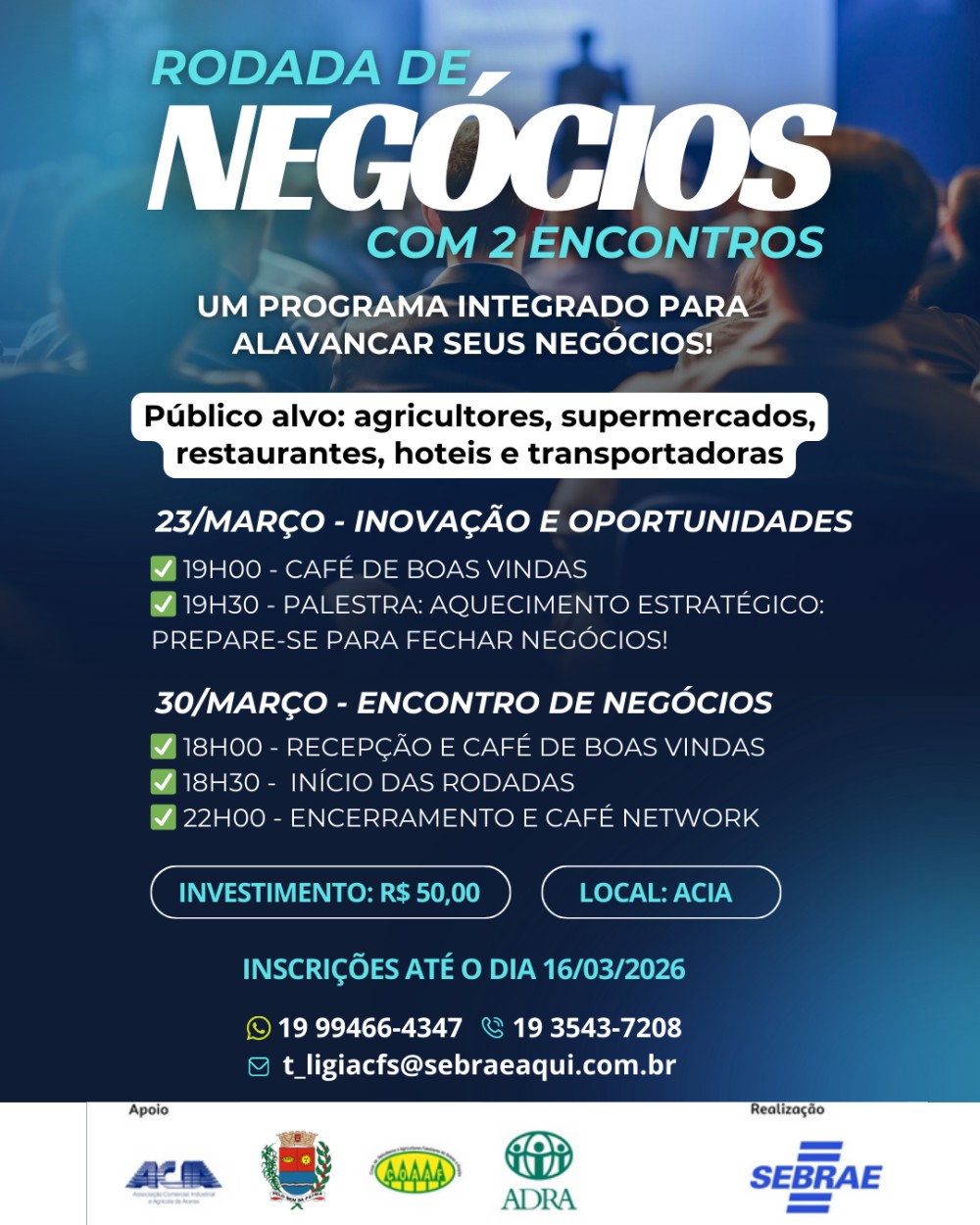 Adesão: R$ 50,00 - Inscrições na ACIA com a Ligia pelo telefone (19) 3543-7208 ou e-mail ligiacfs@sebraeaqui.com.br