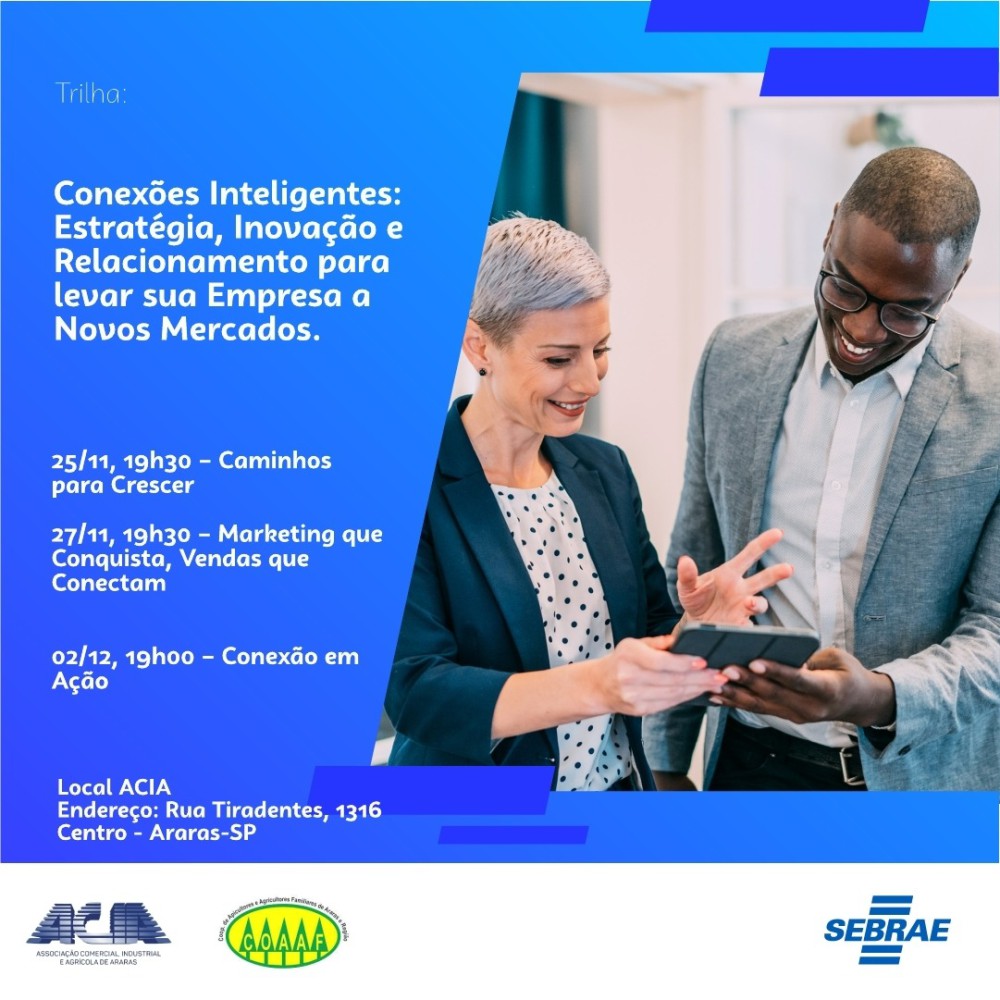 25/nov, 19h30 – Caminhos para Crescer - Aprenda a estruturar o planejamento e a estratégia para conquistar novos mercados.